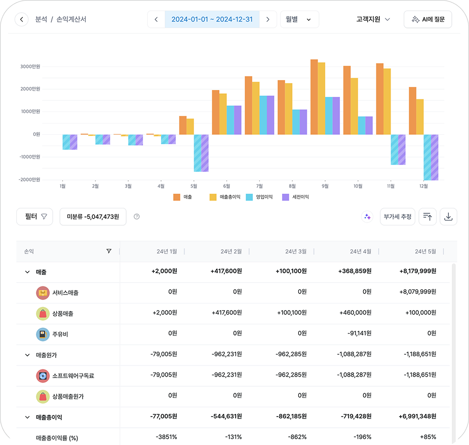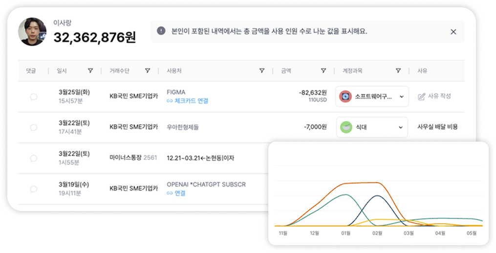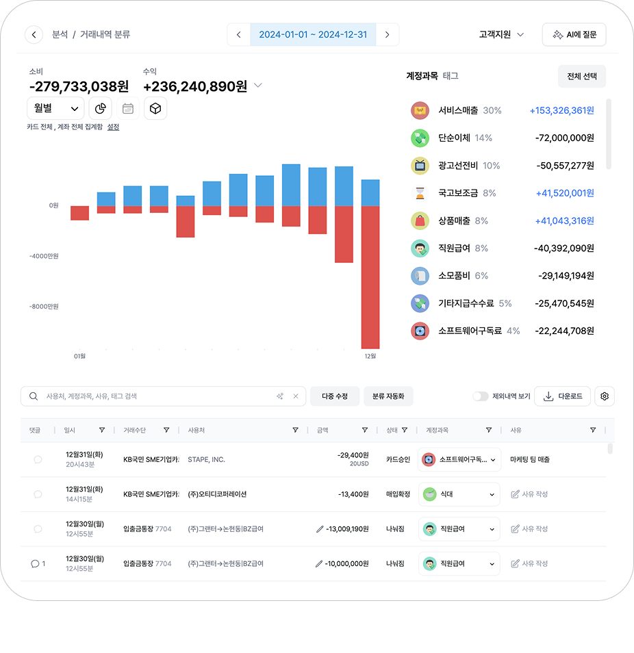 AI가 거래내역을 자동으로 정리하여 자금흐름을 한 눈에 보여드려요.
